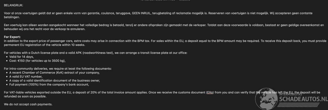 we require at least the following documents: * A recent Chamber of Commerce (KvK) extract of your company * A valid EU VAT number * A copy of a valid identification document of the business owner * Full payment (100%) from the company's bank account * For VAT-liable vehicles exported outside the EU